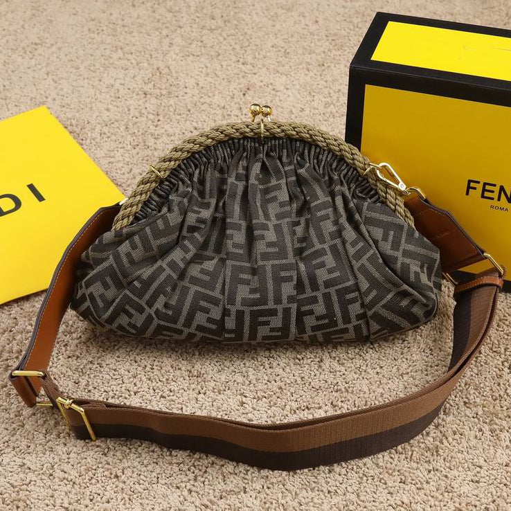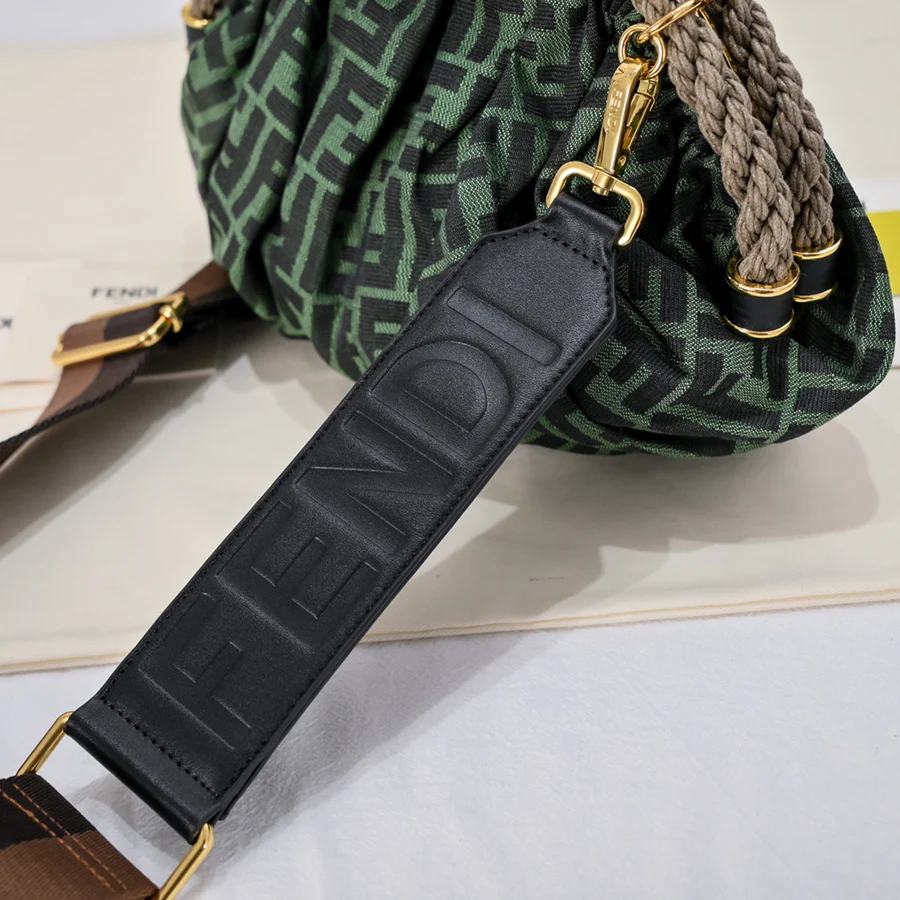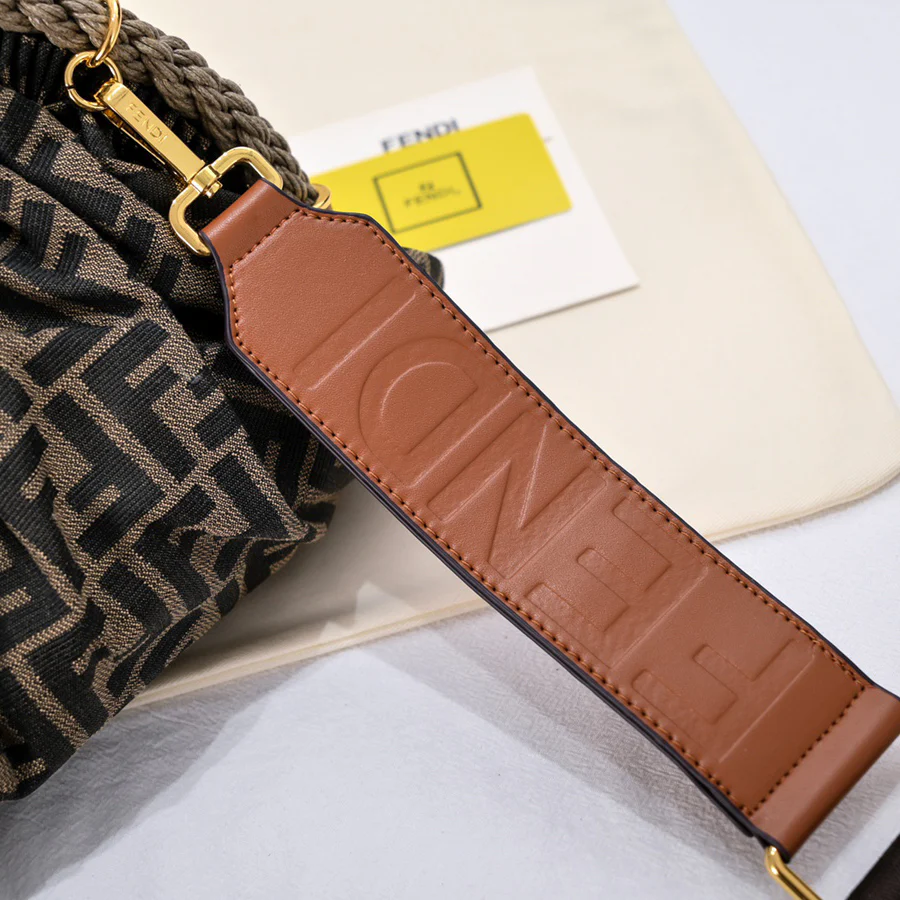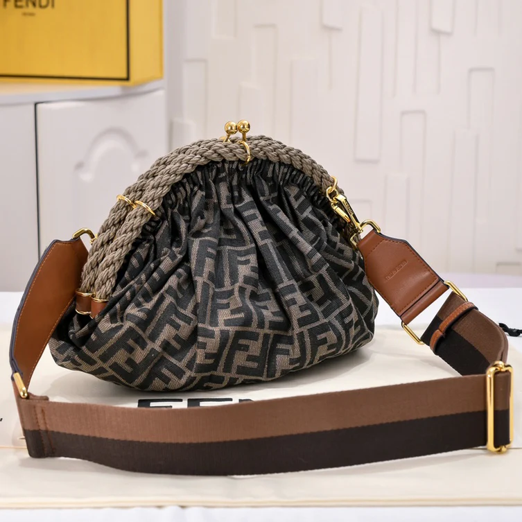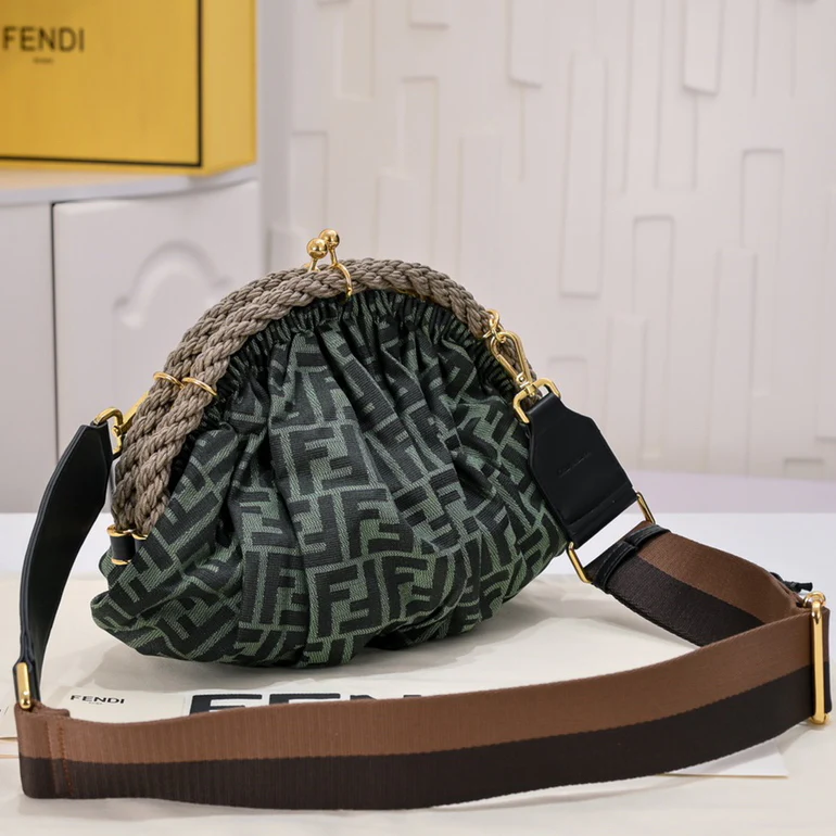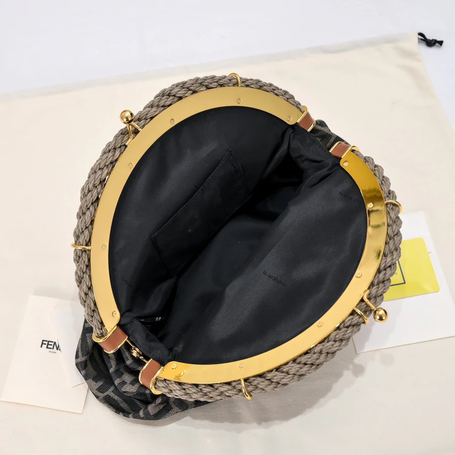 Woven from double-F canvas monogram material. Softly styled with a half-moon metal buckle, the latter adorned with a waxed rope twist loop. Features a lined interior compartment, a small flat pocket and gold-tone metal hardware. It can be carried by hand and has two internal hook-and-loop fasteners for securing the shoulder strap.