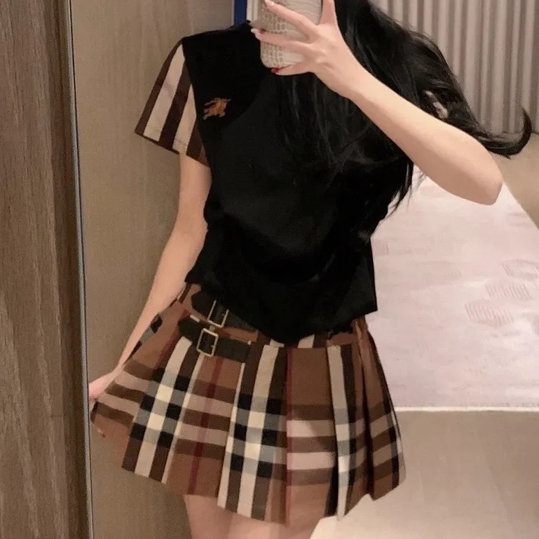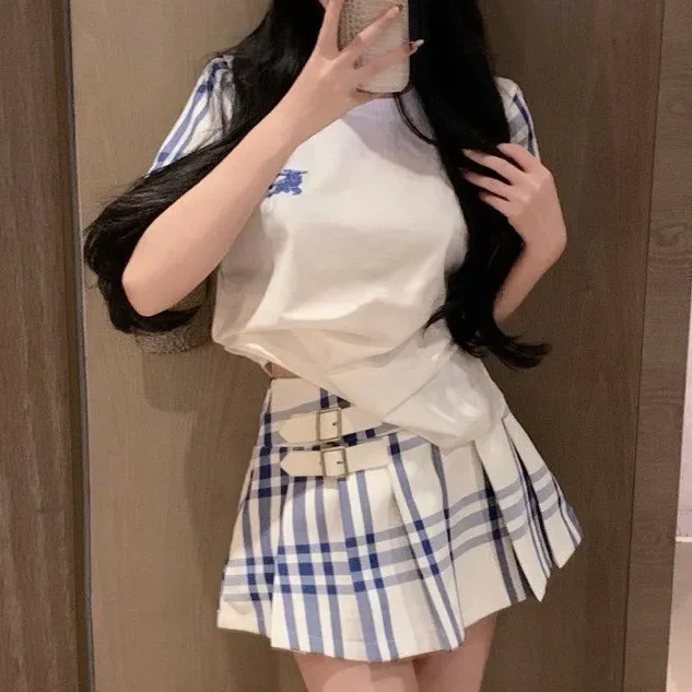 New Classic Plaid Short Sleeve Pleated Skirt Set 1025031422