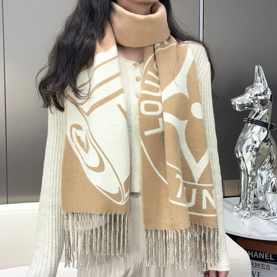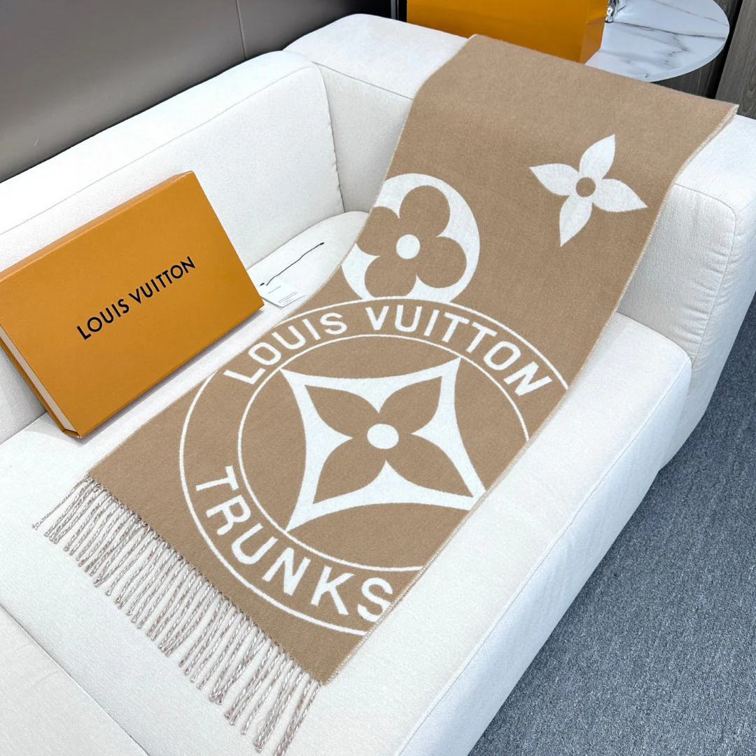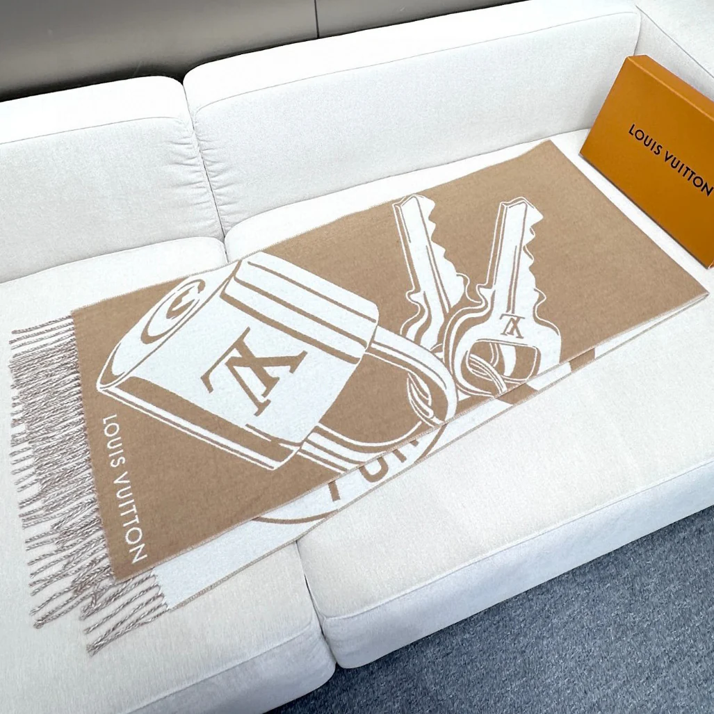 Lock And Keys Scarf crafted from a soft, plush blended fabric. One side features LV padlock and key motifs, while the reverse reveals the Louis Vuitton Trunks monogram, paying homage to the brand's heritage in trunk-making with playful strokes. Delicate fringe trim adds luxurious texture, shielding you from winter's chill. Material: 60% wool, 40% cashmere.