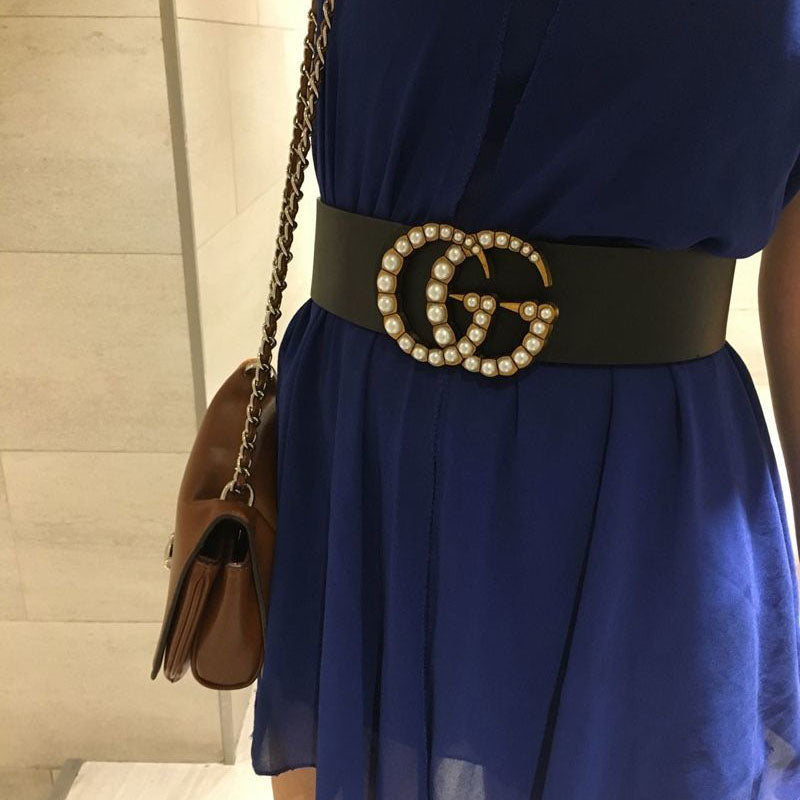 Alphabet Decorated Elastic Girdle Pearl Rhinestone Elastic Wide Belt