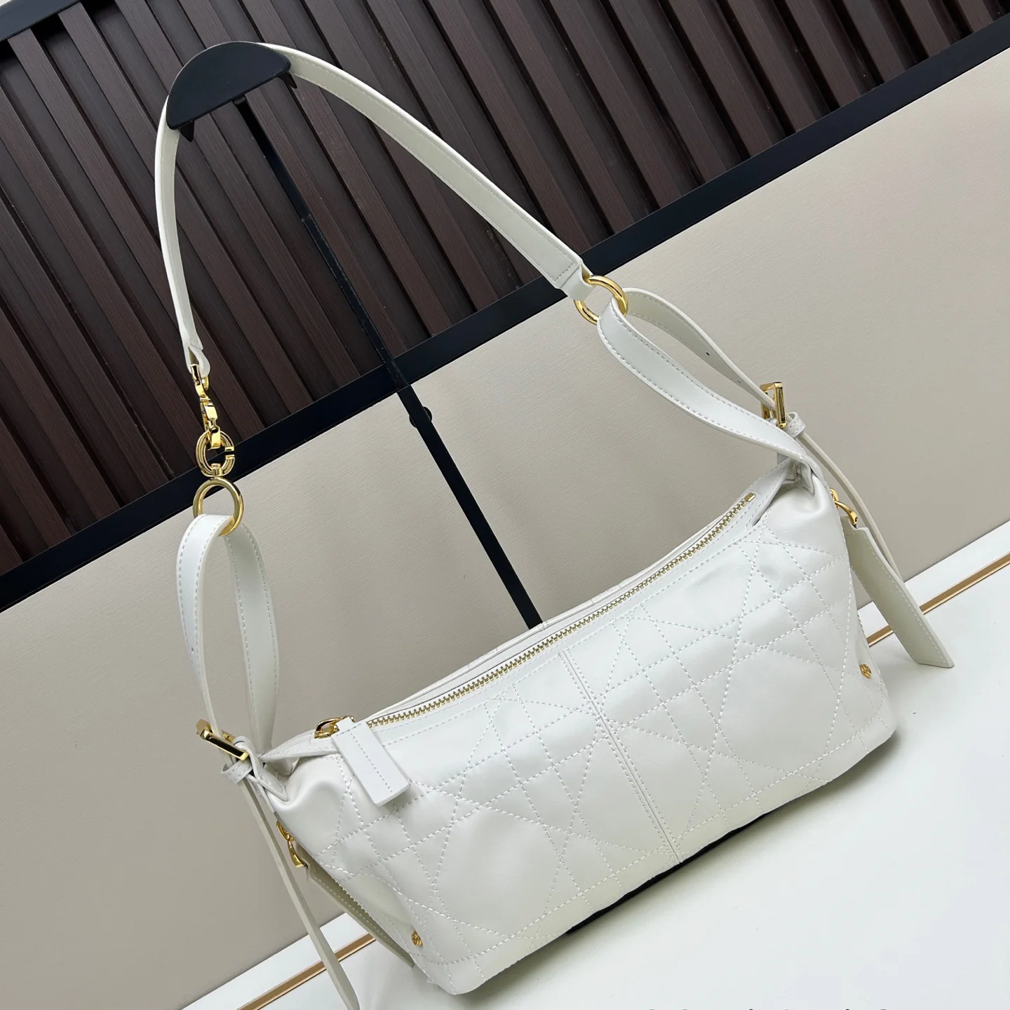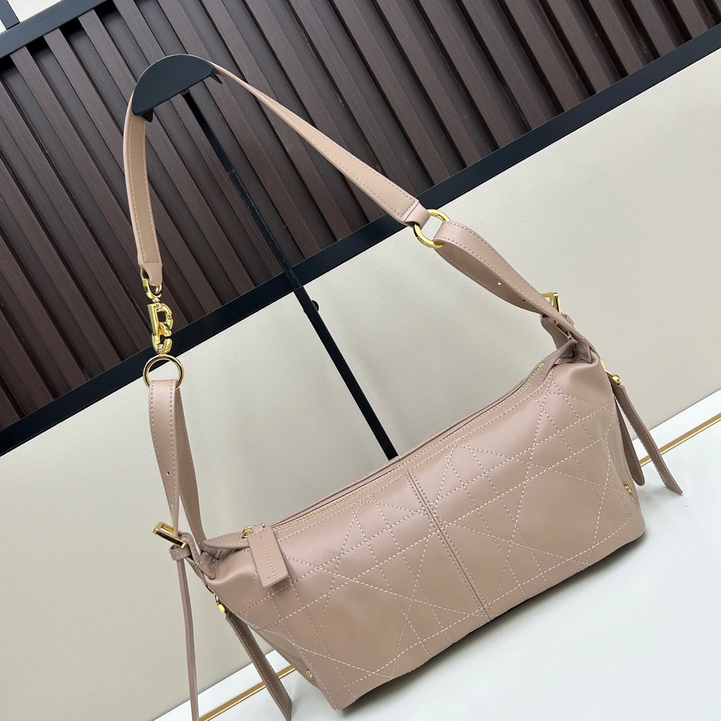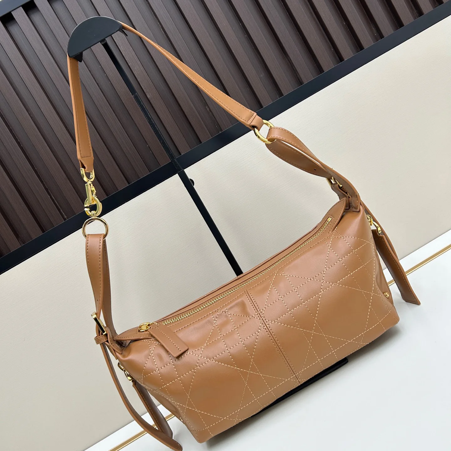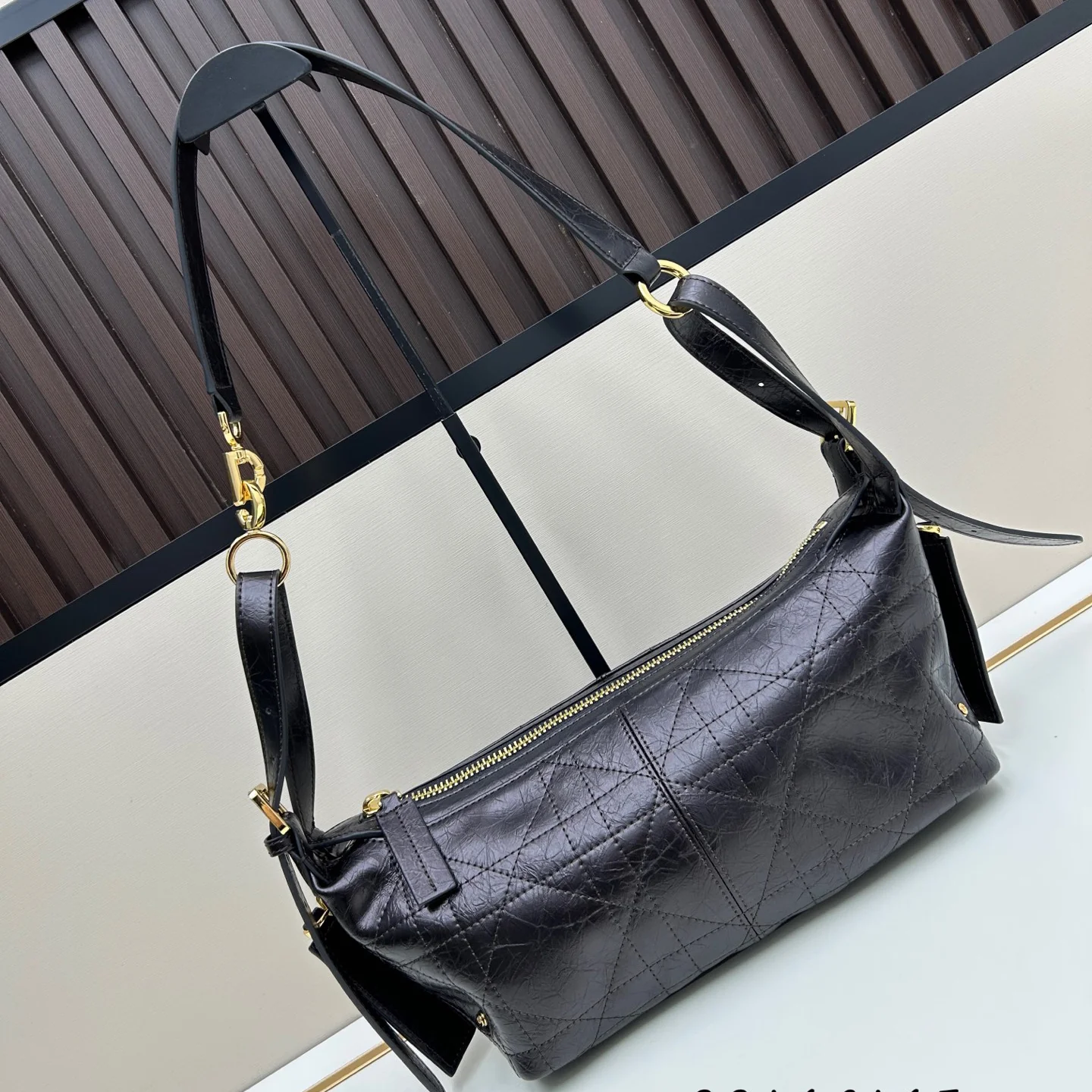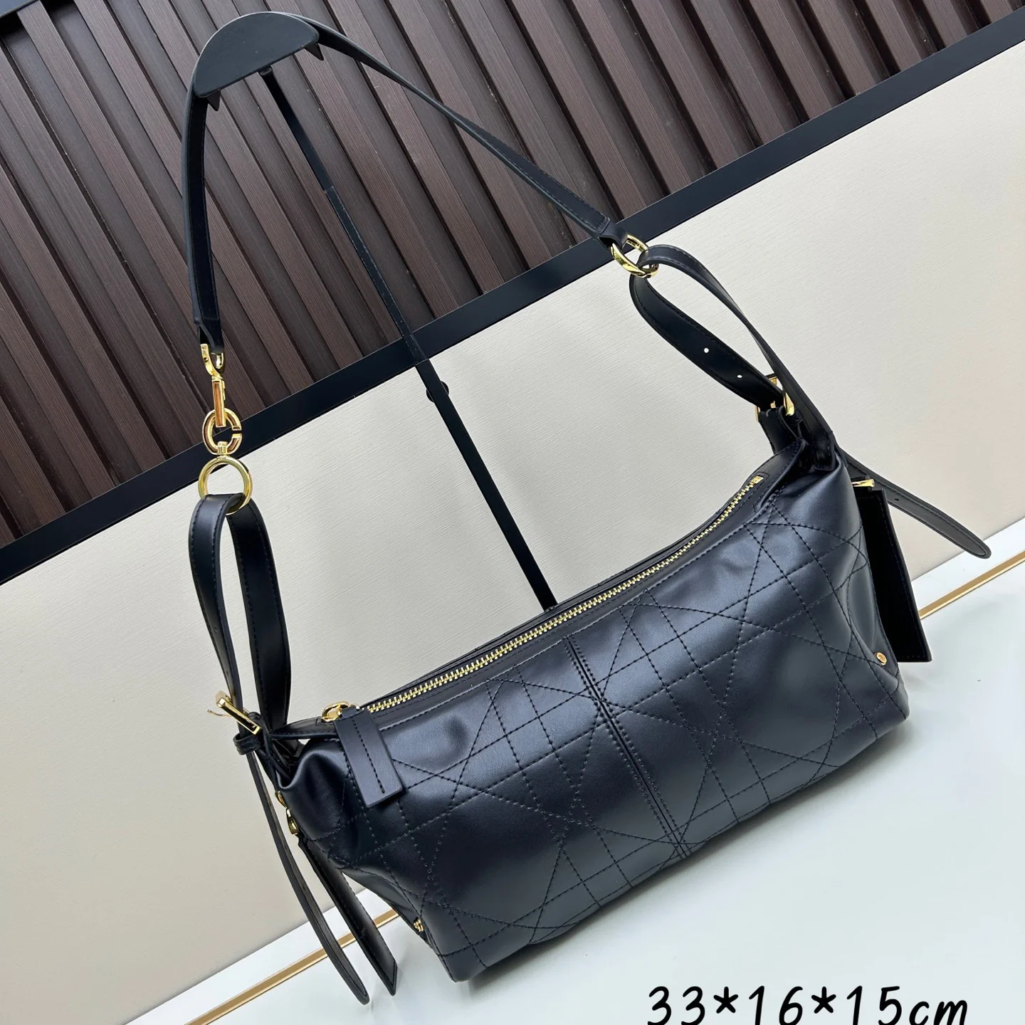 Shoulder strap and adjustable top handle with gold-finish metal hooks
