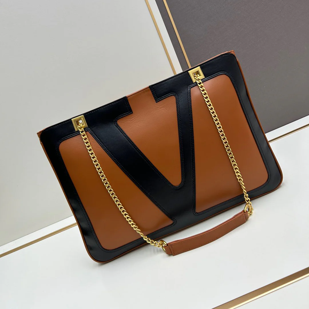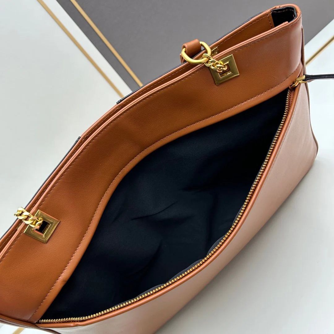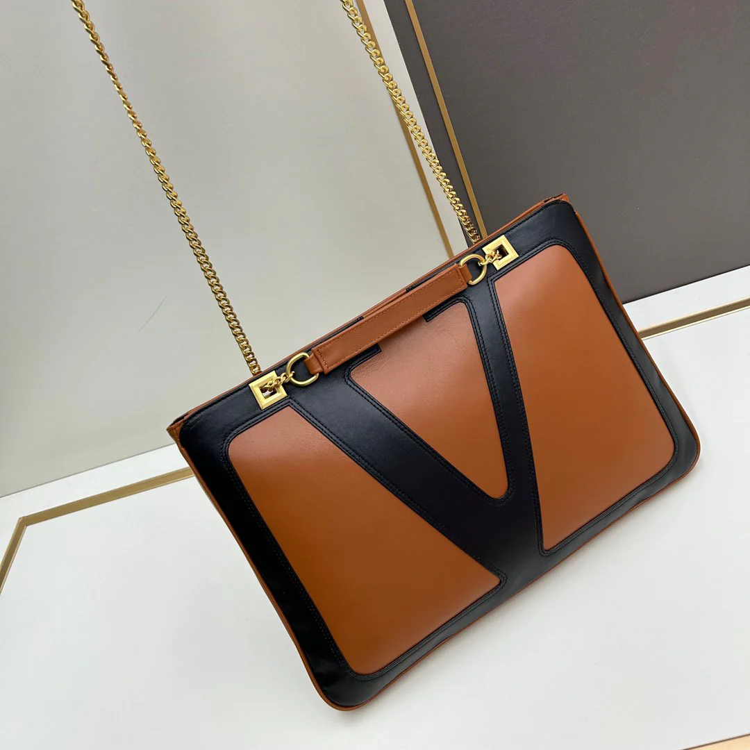 Sliding chain design, can be carried over the shoulder or cross-body -Zipper closure -Exterior one zippered patch pocket.