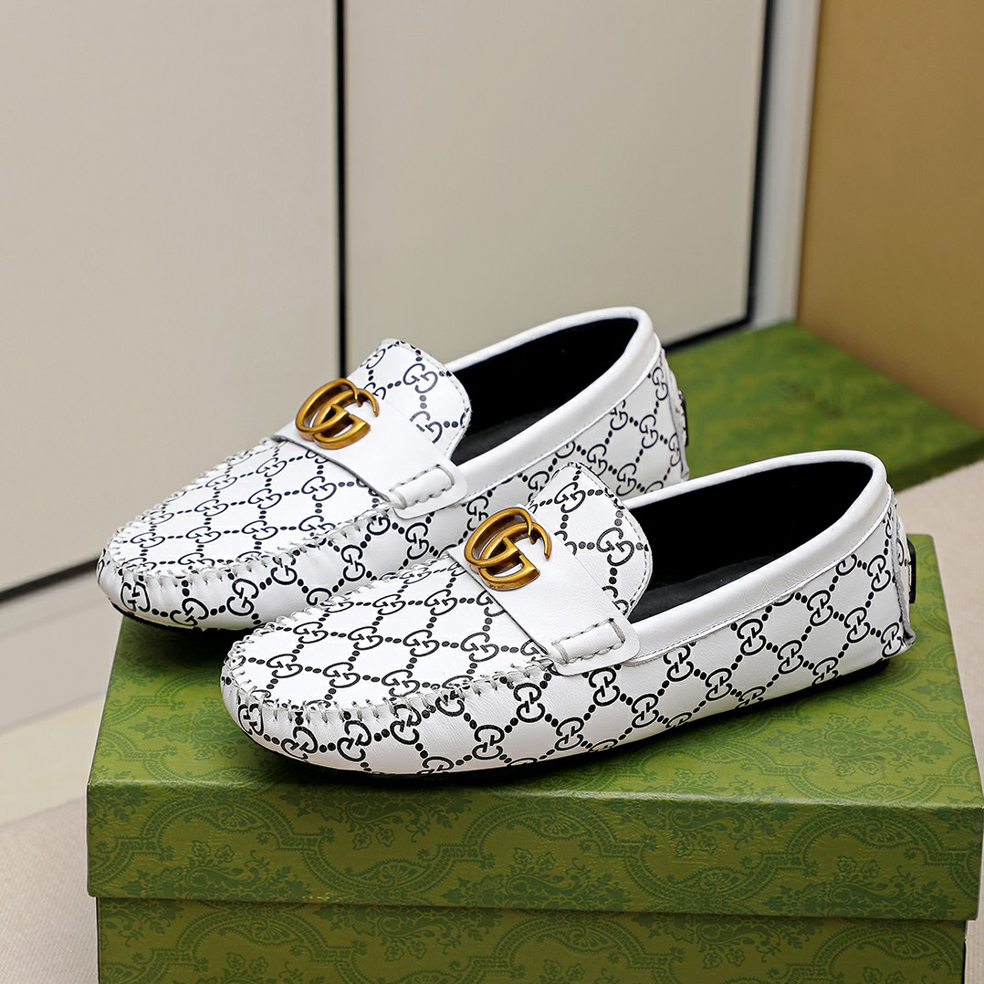 White Leather Shoes Black Print Slip-On Loafers