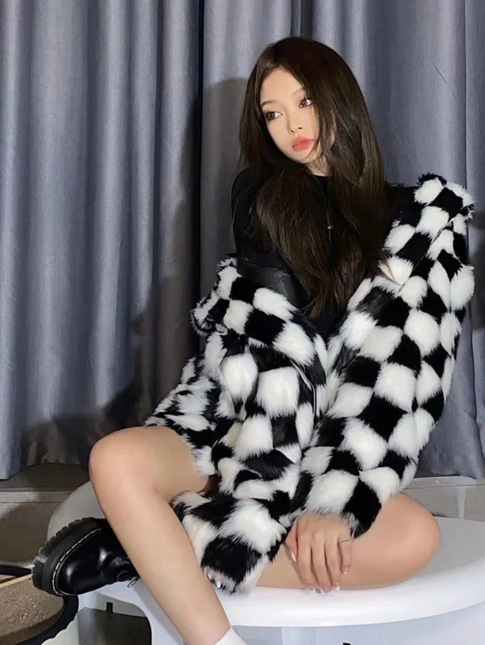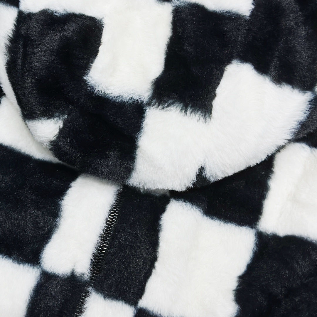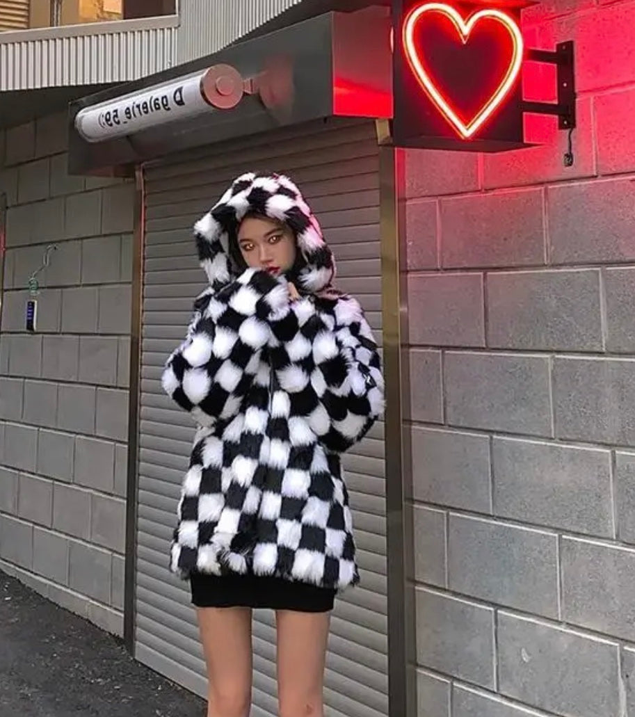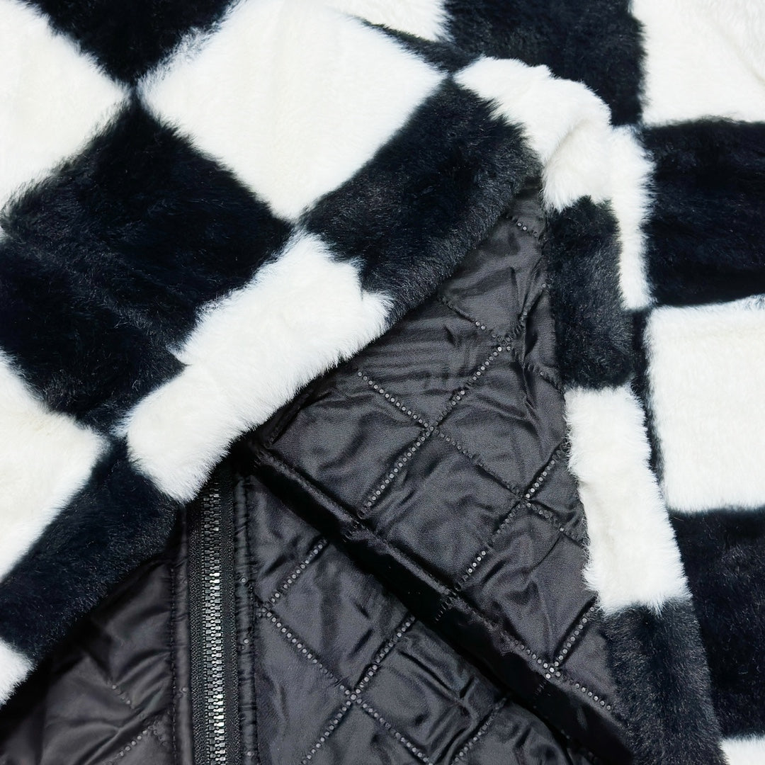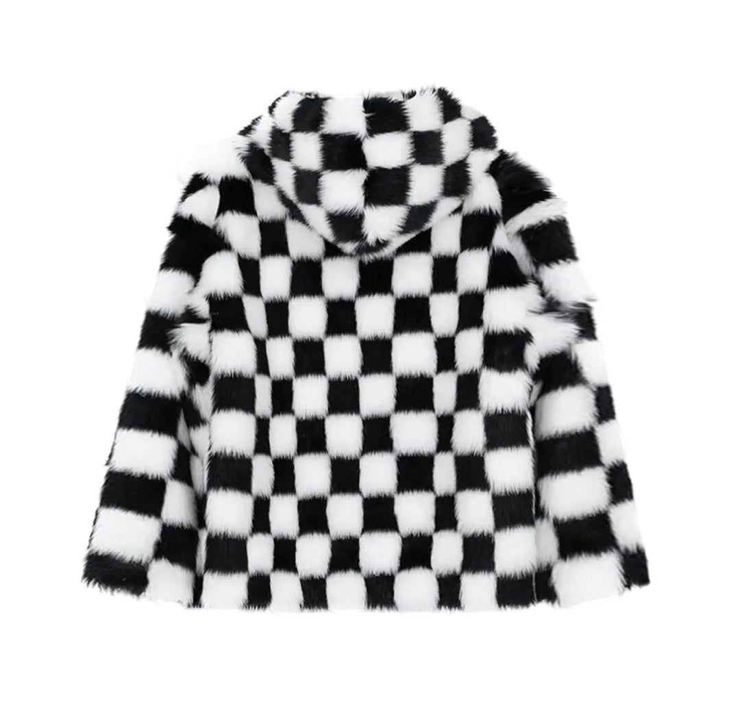 All-over checkerboard hooded rabbit fur jacket XC0823101709