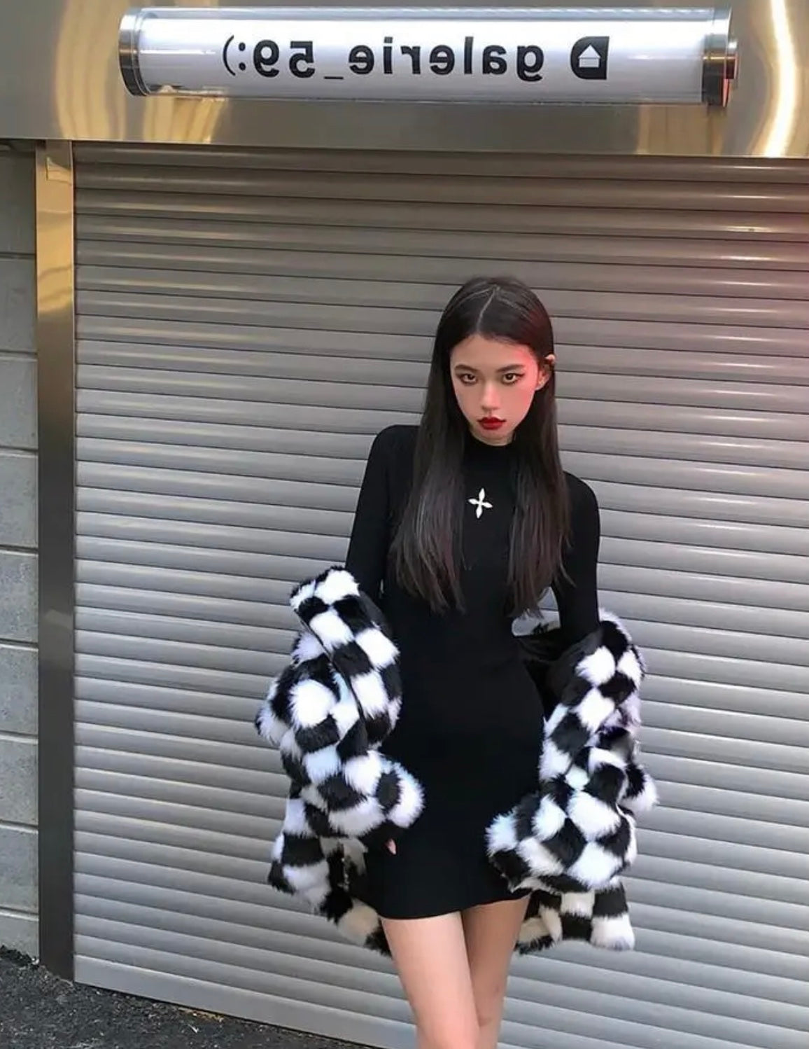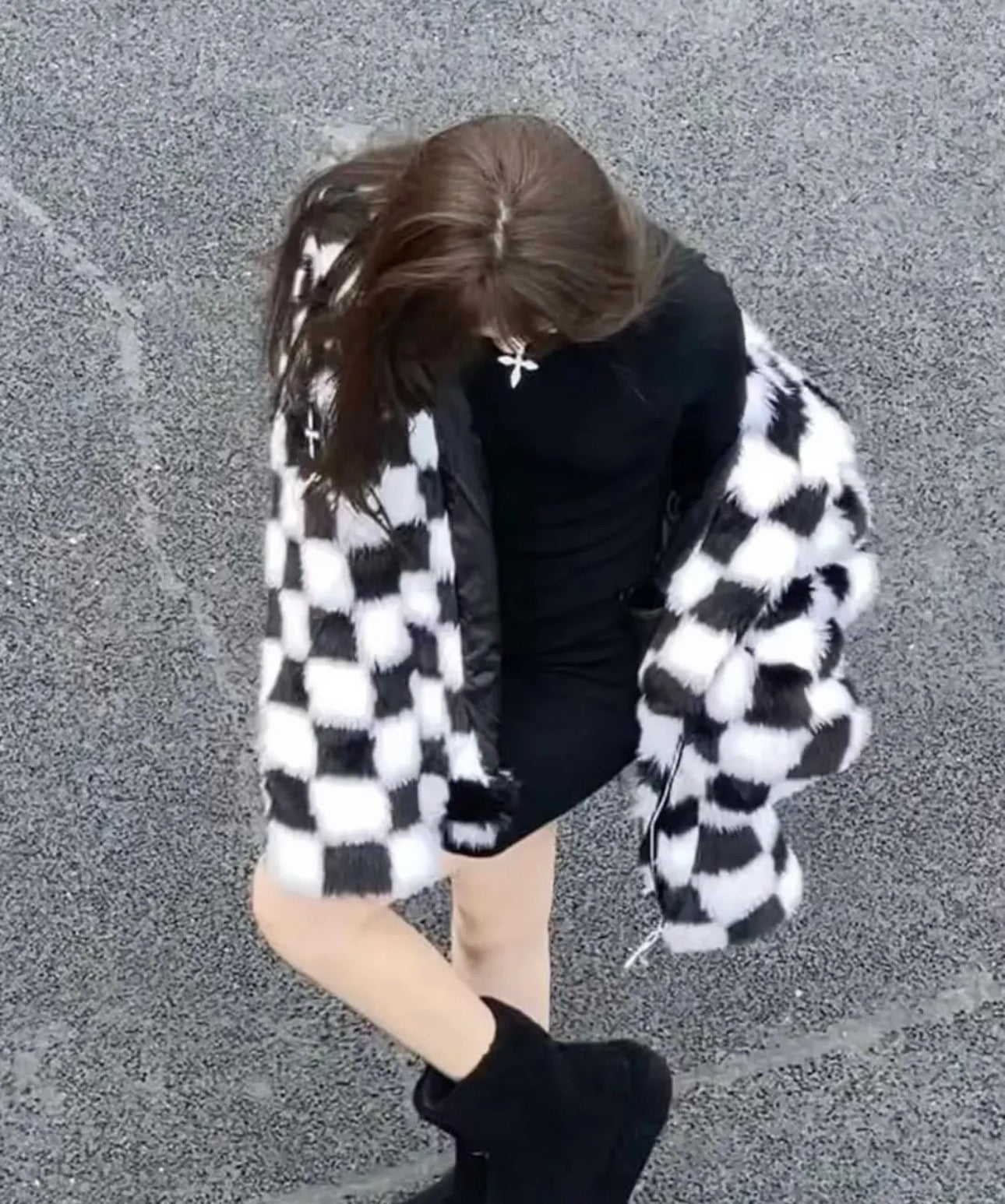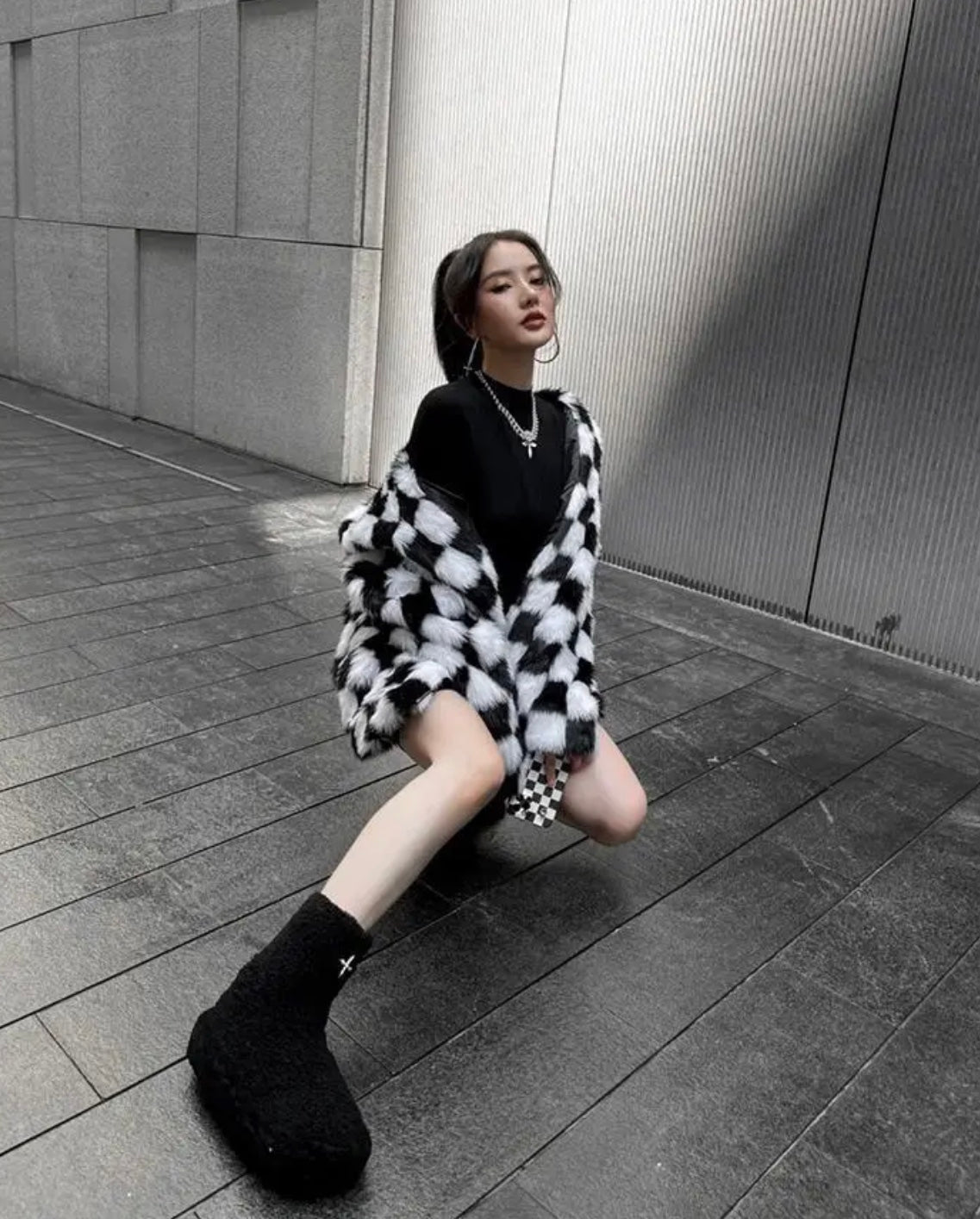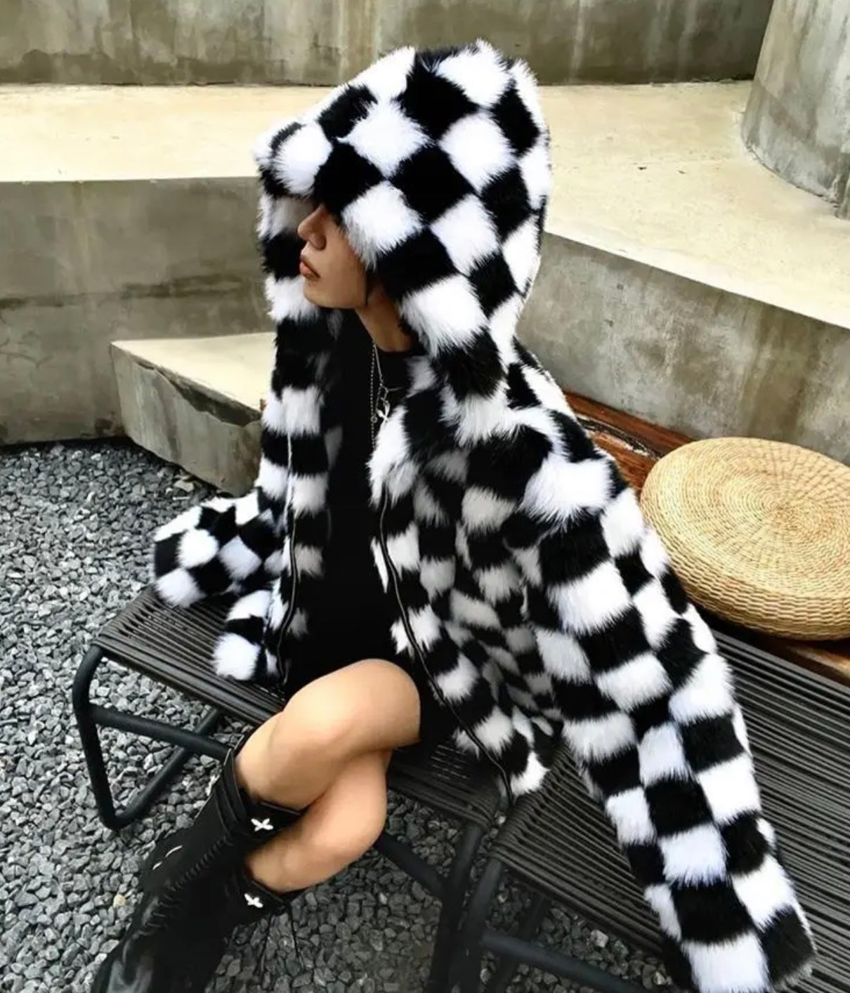All-over checkerboard hooded rabbit fur jacket XC0823101709