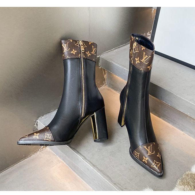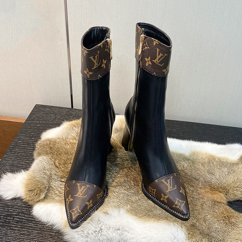Printed British style light luxury high-heeled thick-heeled ankle boots fashion temperament pointed toe high-end women's shoes thin boots